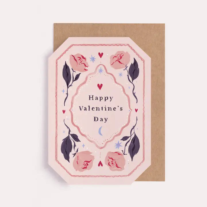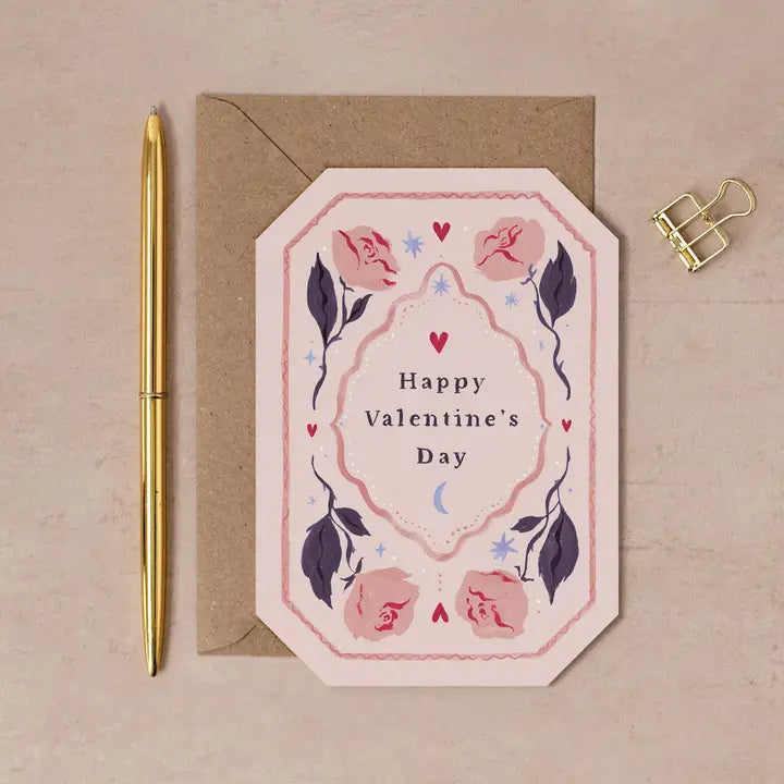 Offrez cette carte de Saint-Valentin en forme de gemme avec de magnifiques roses peintes à la main. La légende manuscrite "Joyeuse Saint-Valentin" ajoute une touche de romantisme. Un cadeau parfait pour votre partenaire lors d'un jour spécial.