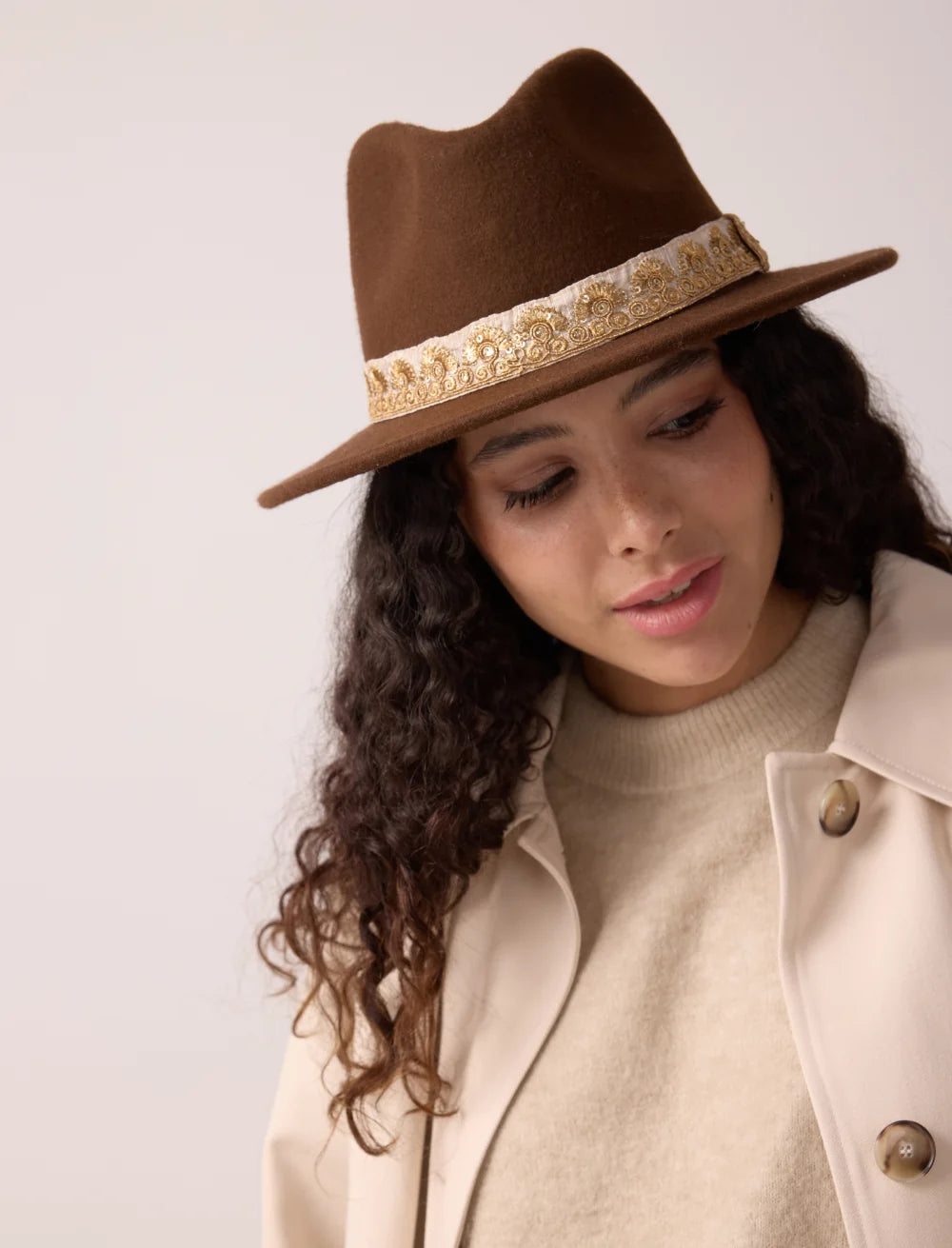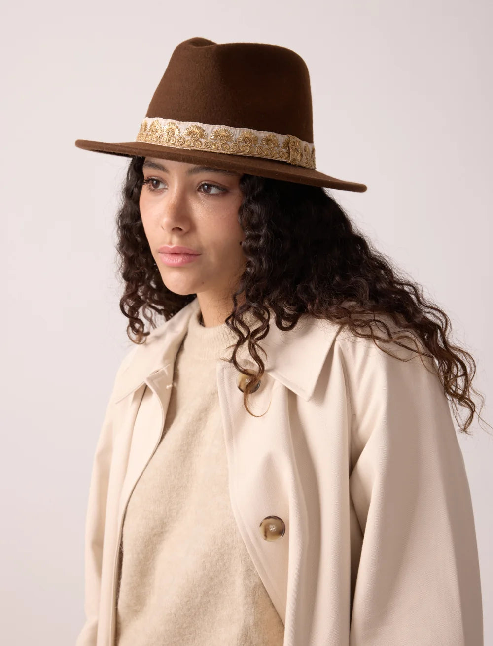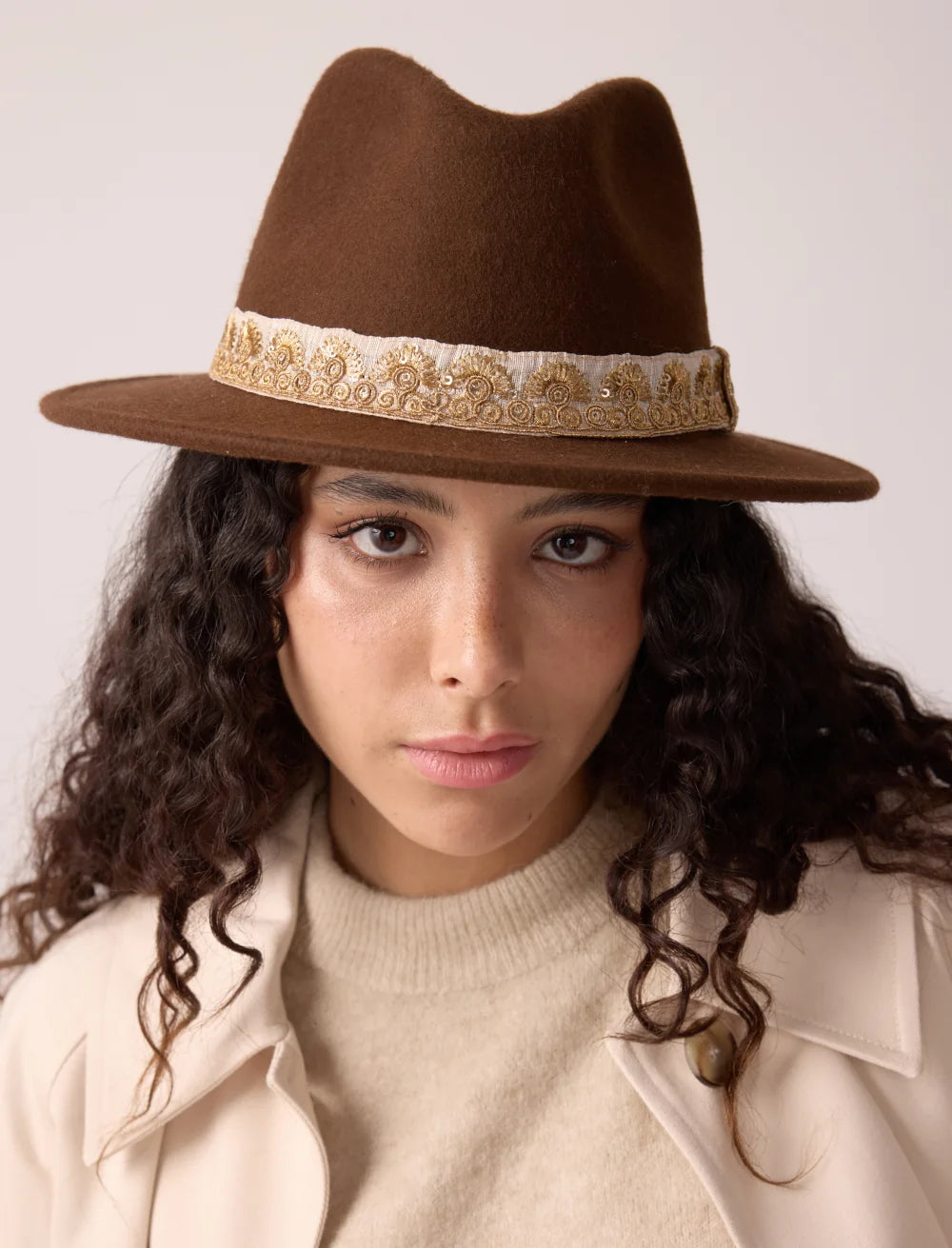 En feutre de laine chocolat, Jim est le chapeau idéal pour vos sorties Automne-Hiver. Soyez toujours élégante avec son galon brodé !