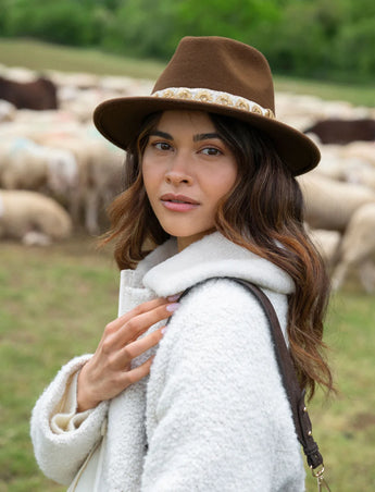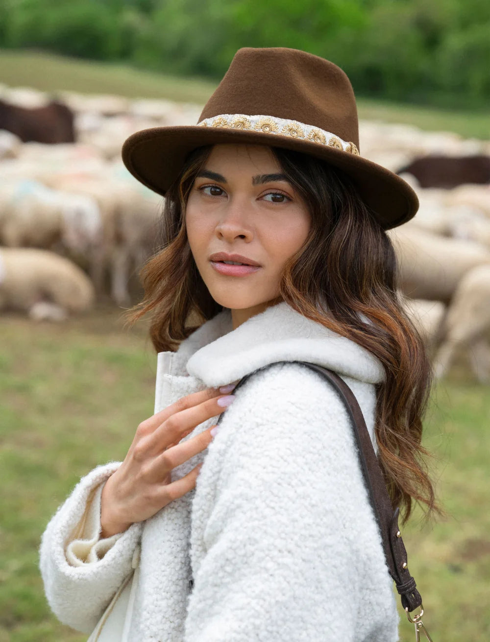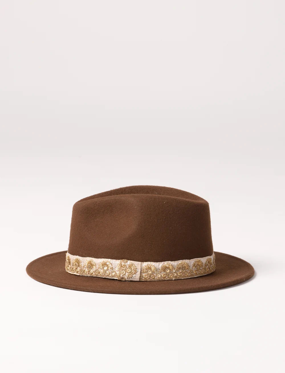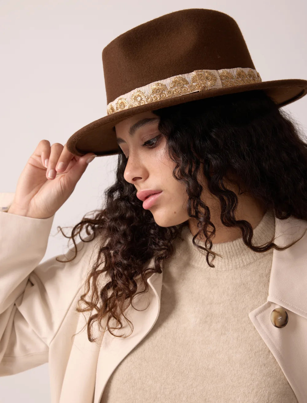 En feutre de laine chocolat, Jim est le chapeau idéal pour vos sorties Automne-Hiver. Soyez toujours élégante avec son galon brodé !