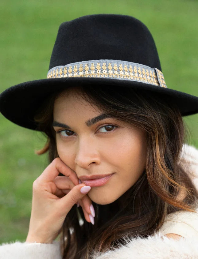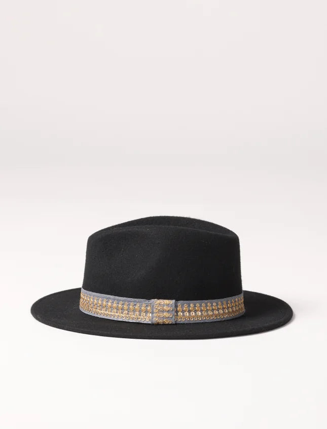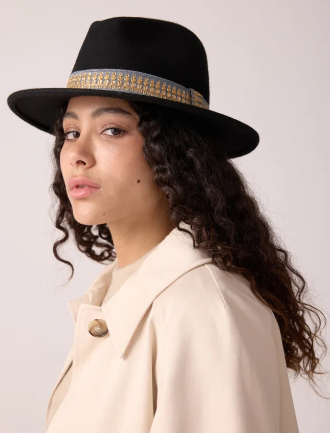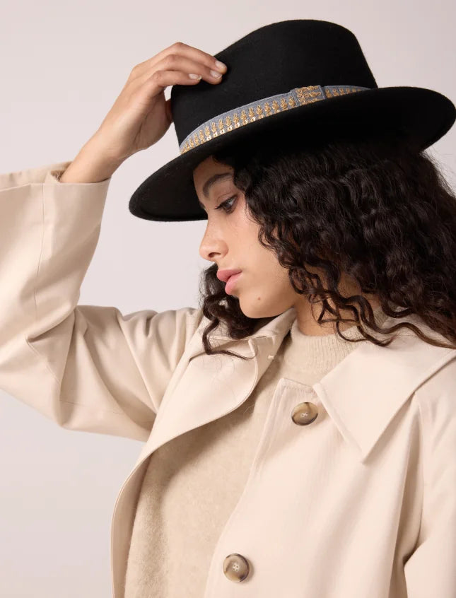 En feutre de laine noir, Jim est le chapeau idéal pour vos sorties Automne-Hiver. Soyez toujours élégante avec son galon brodé !