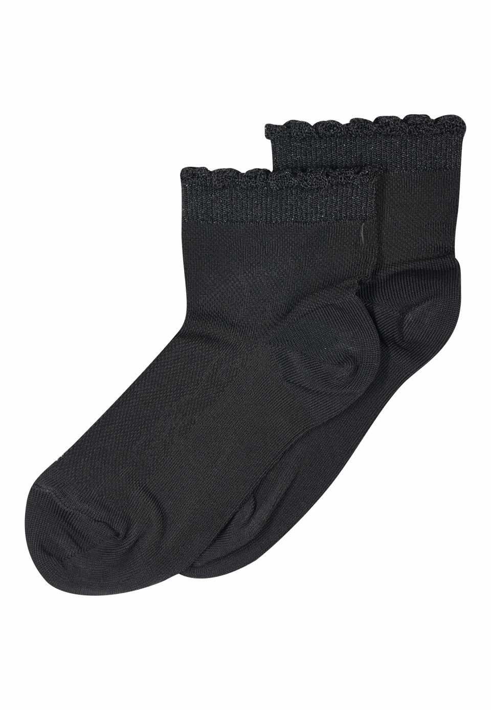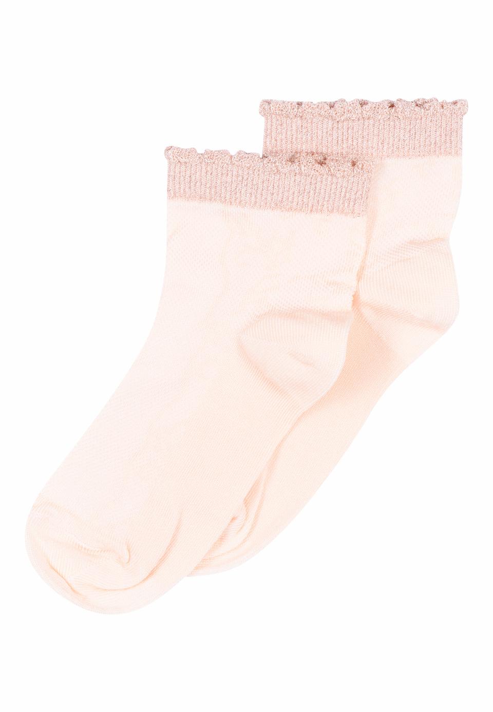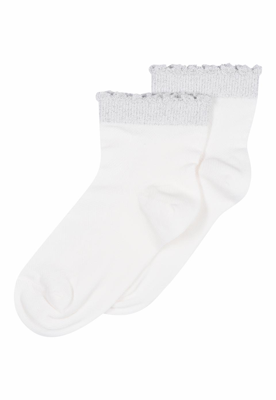 Belle et courte socquette en viscose légère. La chaussette a un tricot ajouré décoratif et féminin sur le pied. De plus, il a des détails pailletés et un joli bord volanté en haut de l'élastique autour de la cheville.