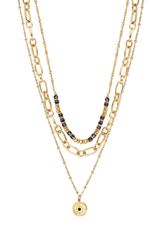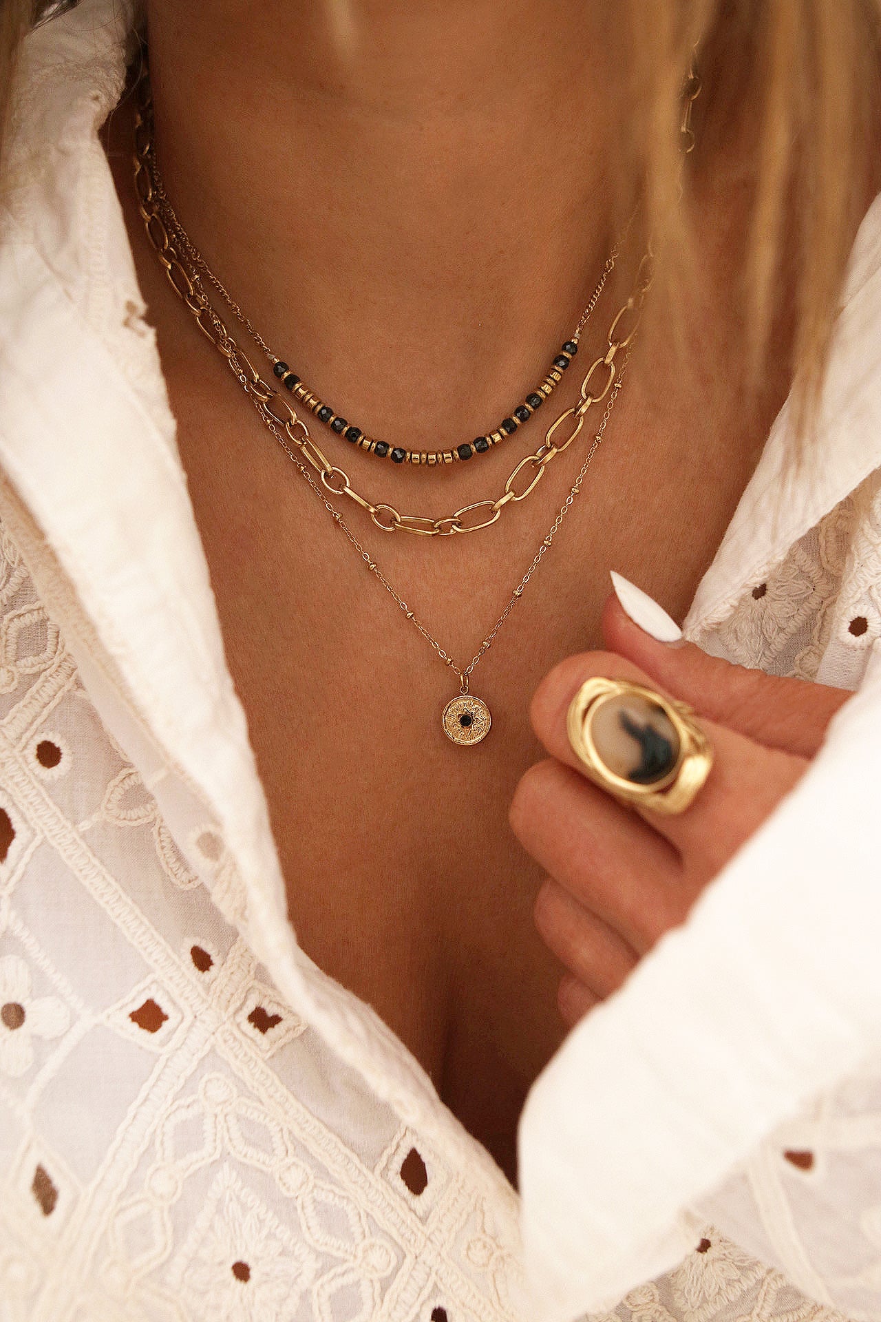 Le collier Tara dévoile une superposition raffinée de chaînes dorées et de perles sombres scintillantes, évoquant la rencontre entre lumière et mystère. Son pendentif central délicatement gravé apporte une touche de charme spirituel et d’élégance intemporelle. Un bijou de caractère, parfait pour illuminer vos tenues avec subtilité et sophistication.
