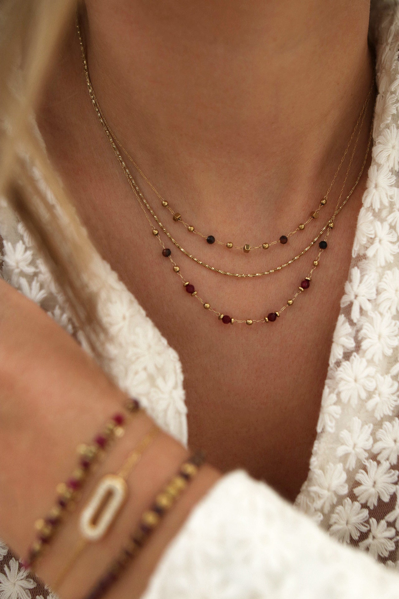 Le collier Triple Mara raffiné et intemporel, il se porte aussi bien seul pour une touche chic que superposé à d’autres colliers pour un look bohème et solaire.