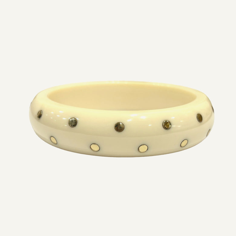 Jonc large arrondi en acétate de couleur unie et pois en métal doré. Finition brillante.