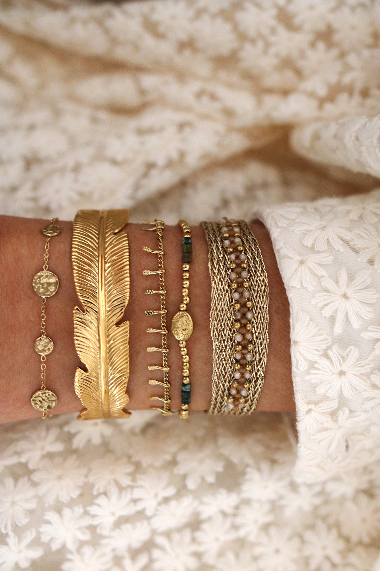 La manchette Elya en acier inoxydable doré, c'est un bijou puissant et raffiné, symbole de féminité et de lumière intérieure.
