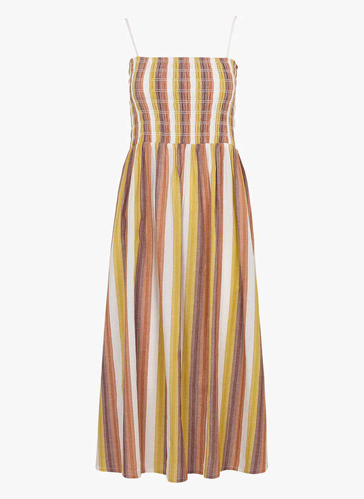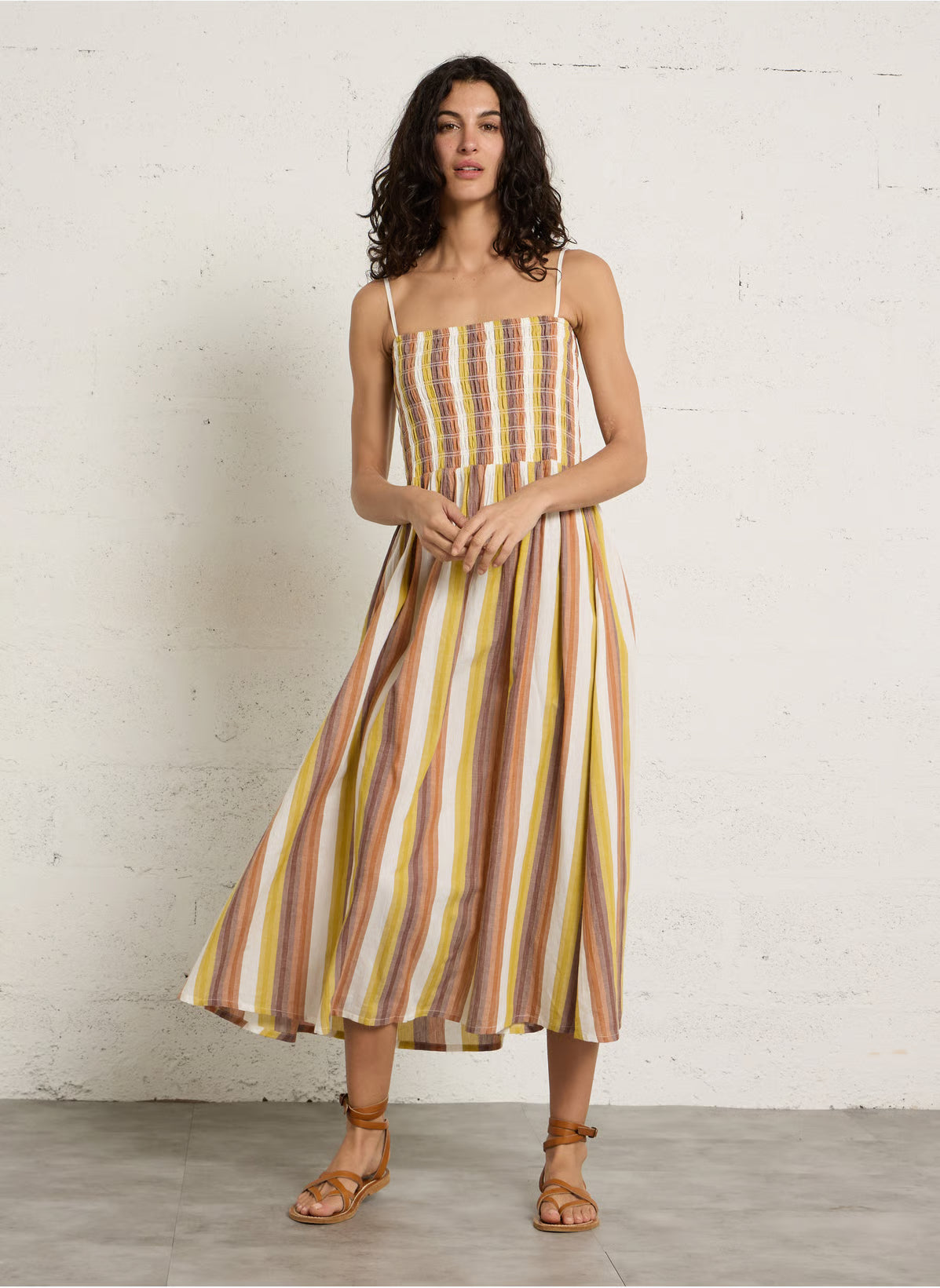Robe midi à rayures, légère et fluide, avec bustier smocké et fines bretelles. Sa coupe évasée et ses teintes chaudes offrent une silhouette naturelle, parfaite pour l’été.